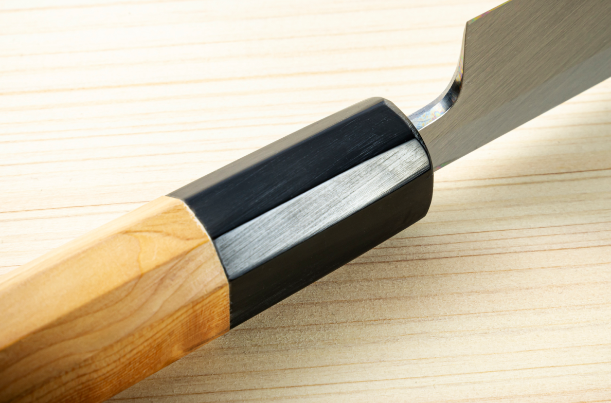 柄は通常、木材(例えば、一位木や黒檀など)が使われ、これにより包丁のバランスや使い心地が決まります。