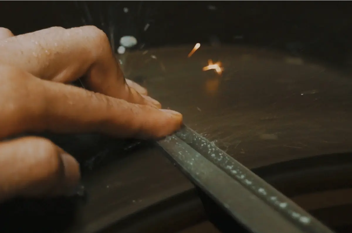 鍛造後、刀身の形状を整えるために行う「荒研ぎ」、荒研ぎの後、包丁の切れ味をさらに磨き上げるための「本研ぎ」に分かれており、堺打刃物の片刃包丁では、片側だけを研ぐため、非常に繊細な技術が必要です。